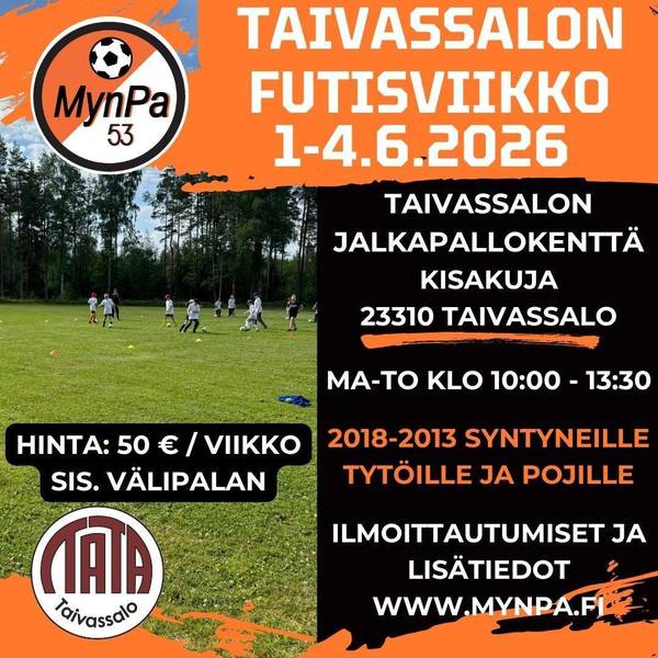 Tervetuloa mukaan viettämään mahtavaa jalkapalloleiriä Taivassalon Tahdin ja MynPan Futisviikkolle maanantaista torstaihin 1.6-.4.6.2026 !