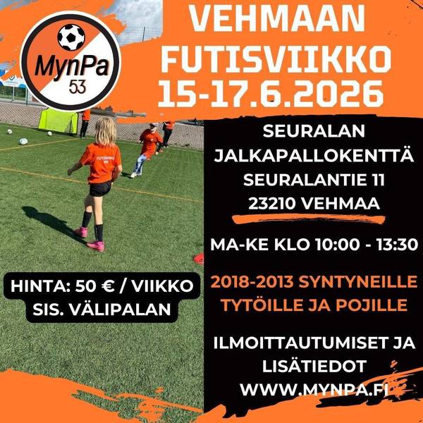 Ilmoittaudu heti mukaan tämän lomakkeen kautta ja kerro myös kavereillesi MynPan Futisviikosta Vehmaalla.